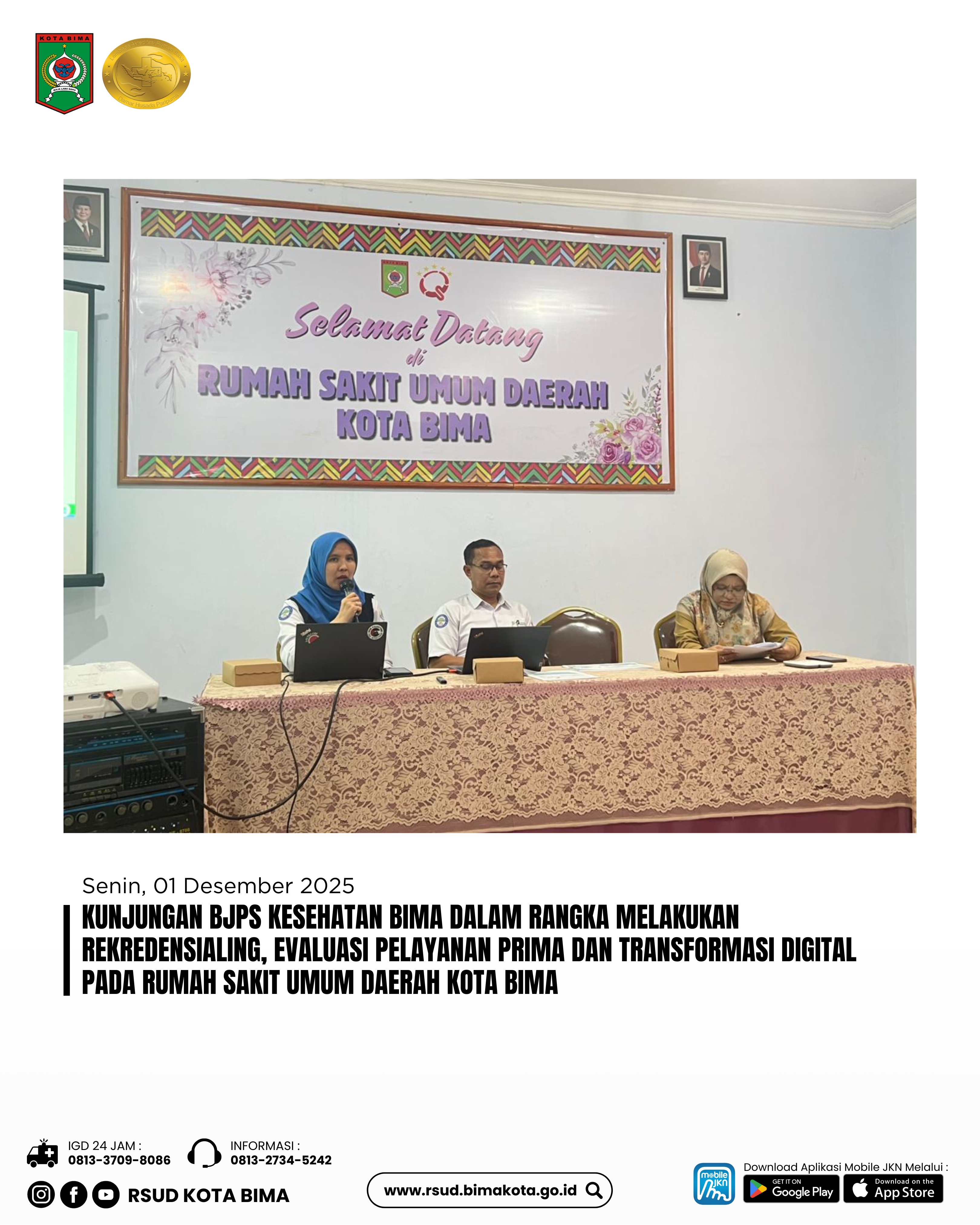 Kunjungan BPJS Kesehatan Bima dalam rangka melakukan Rekredensialing, Evaluasi Pelayanan Prima dan Transformasi Digital berkenaan dengan proses perpanjangan kerjasama, evaluasi pelayanan prima, yaitu SiBLing, KESSAN dan penginputan SIPP serta capaian transformasi digital, yaitu pemanfaatan antrean online, antrol Mobile JKN dan Waktu Tunggu Pelayanan Poli pada RSUD Kota Bima.